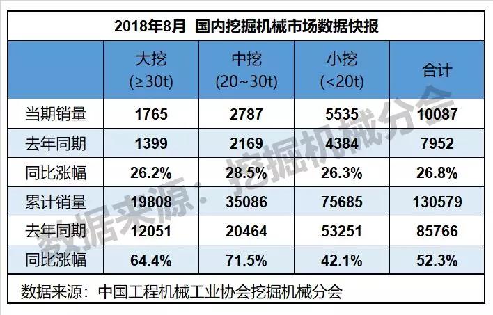 根據中國工程機械工業協會挖掘機械分會行業統計數據,2018年1—8月納入統計的25家主機制造企業,共計銷售各類挖掘機械產品142834臺,同比漲幅56.2%。國內市場銷量(統計范疇不含港澳臺)130579臺,同比漲幅52.3%。出口銷量12163臺,同比漲幅115.6%。