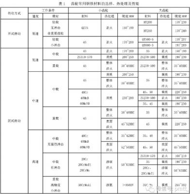 齒輪選用鋼鐵材料時,必須滿足兩個基本要求:一是加工和熱處理要求,其中包括鋼的機械加工性能、鑄造性能、鍛造性能和熱處理性能;二是使用性能要求,包括疲勞強度、熱處理規(guī)范和其他性能指標。齒輪常用鋼鐵材料的選擇、熱處理及性能見表1。調質及表面淬火齒輪用鋼的選擇見表2。