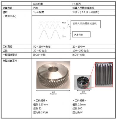 相對于以往汽車用齒輪模數1~4,精度要求ISO8~9級的量產型齒輪加工,此次推出的FR系列專注于機器人減速機所需的齒輪模數可達到1以下,高精度要求也可實現ISO3~6級的齒輪加工。