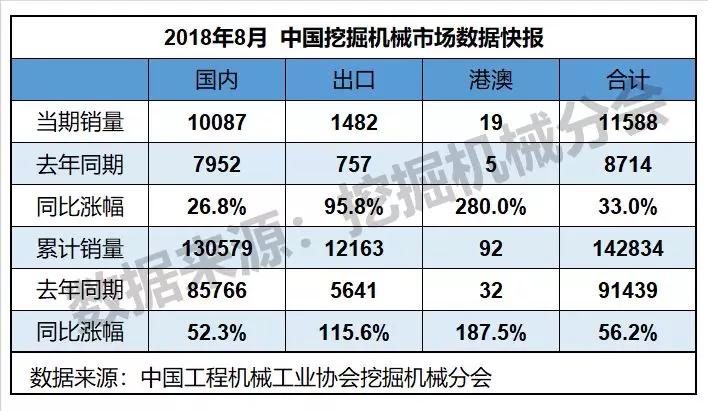 2018年8月,共計銷售各類挖掘機械產品11588臺,同比漲幅33.0%。國內市場銷量(統計范疇不含港澳臺)10087臺,同比漲幅26.8%。出口銷量1482臺,同比漲幅95.8%。